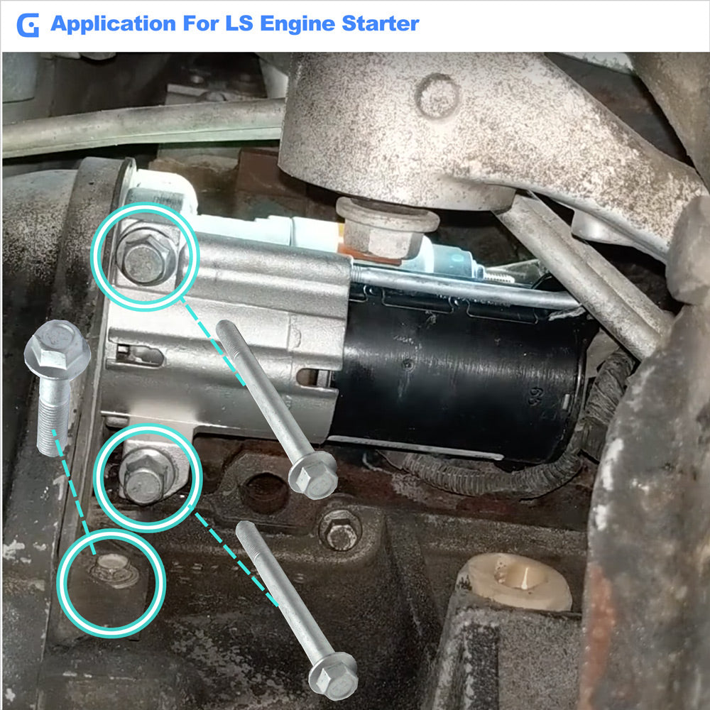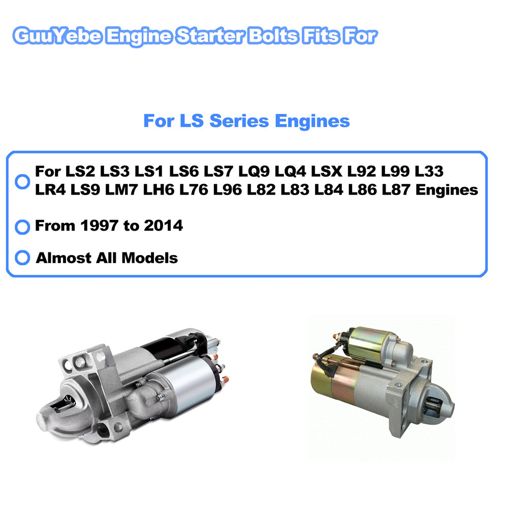 - GuuYebe Starter Bolts Kit Replace For LS Starter Bolts Kit and GuuYebe Starter Bolts Kit is made by Grade 10.9 Carbon Steel and Zinc coated.Starter Bolts Set Kit will provide long-lasting corrosion protection against thread seizure.Metric Flange Bolts of Flange Head is design by Jis Head Standard to easy to match your tools for installation.GuuYebe Starter Bolts Kit is Heavy duty and high strength.GuuYebe OEM Metric Flange Bolts is 100% for LS Starter Bolts.